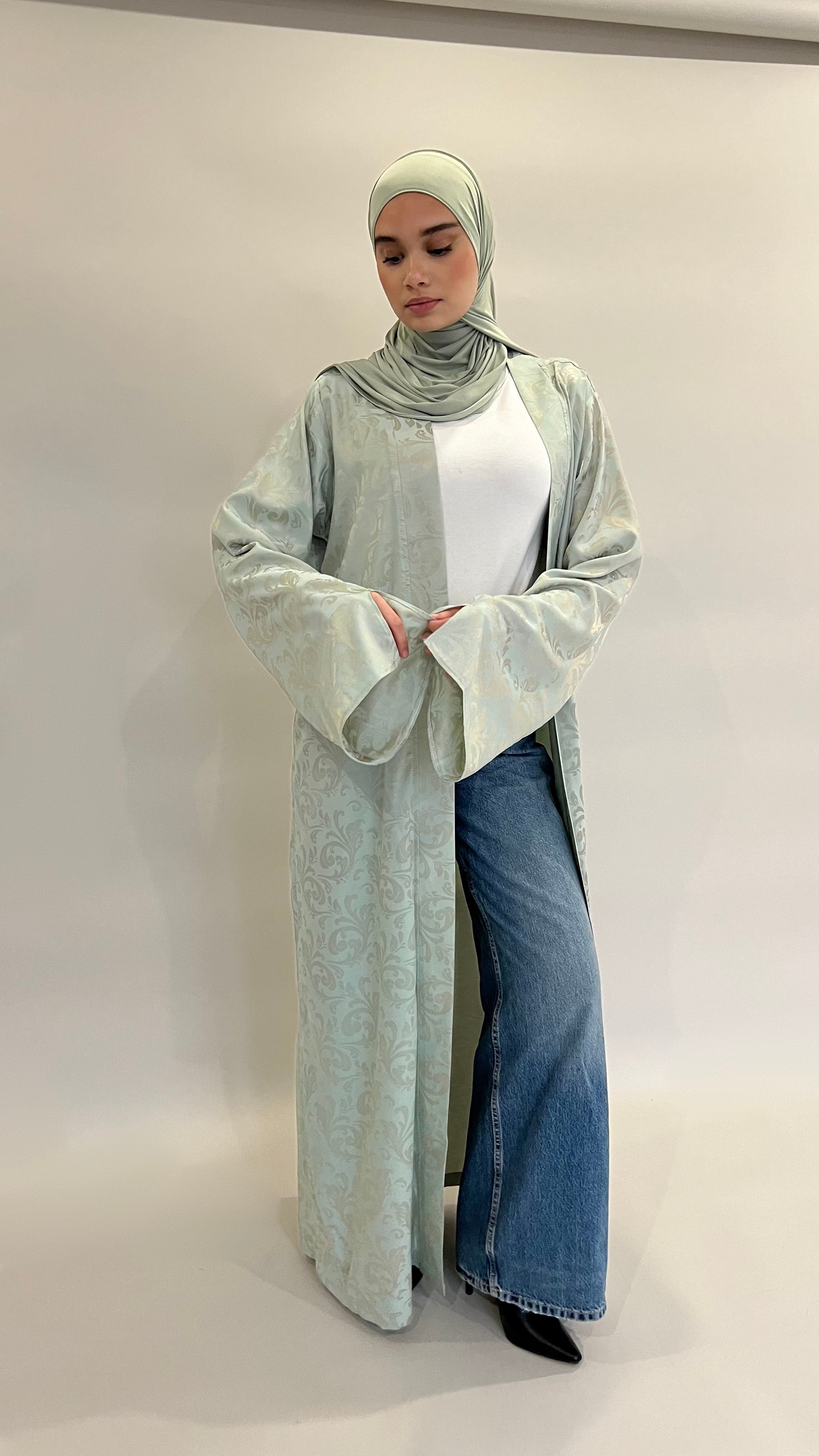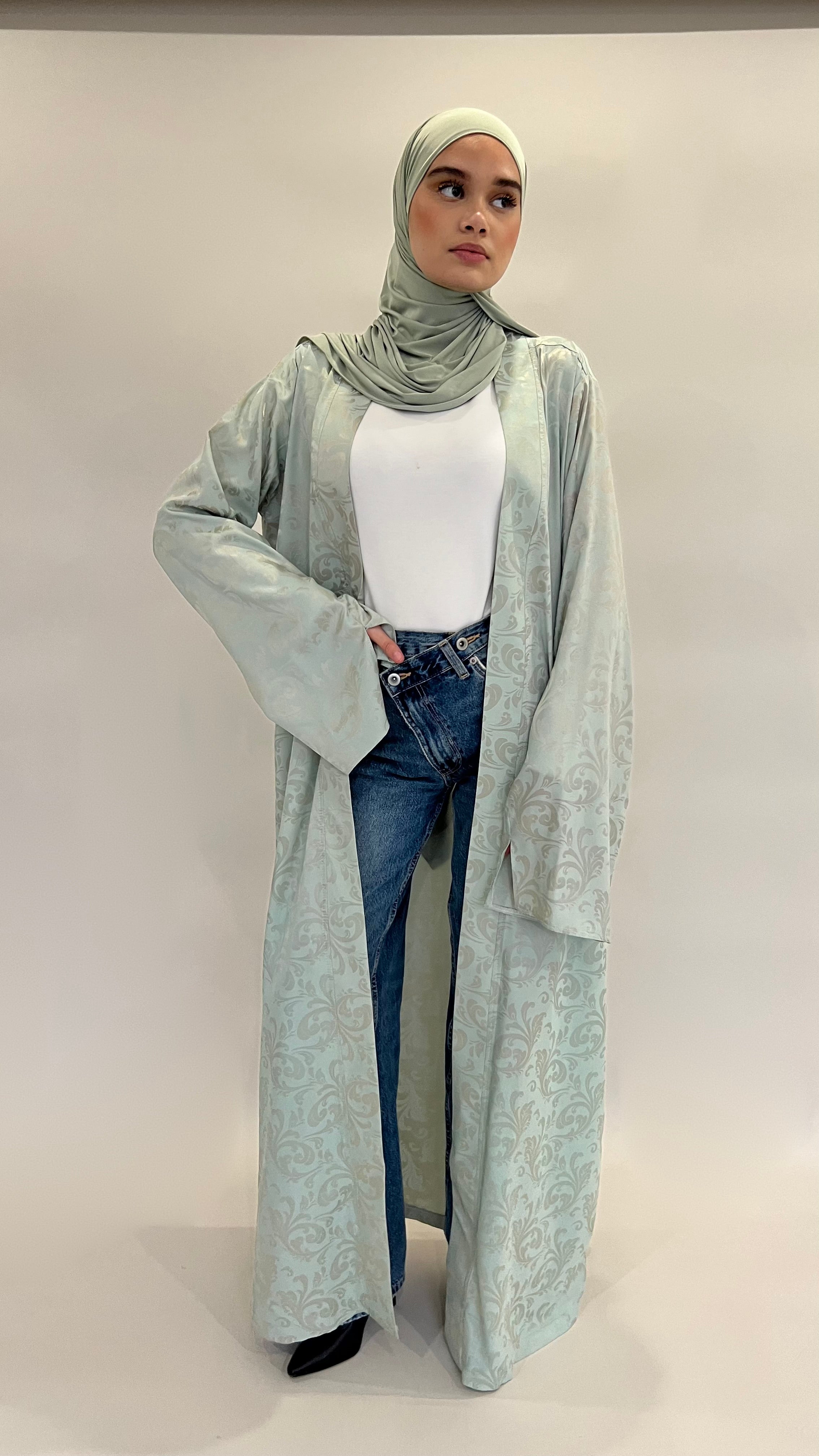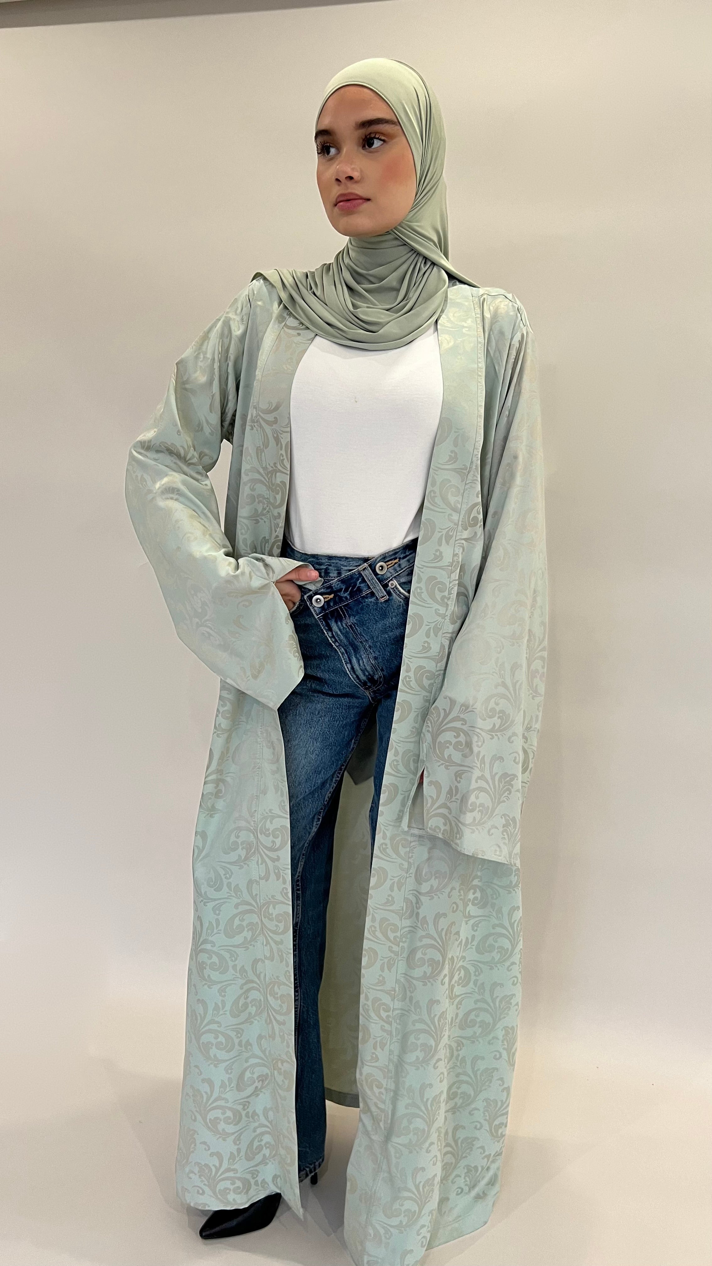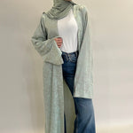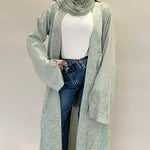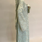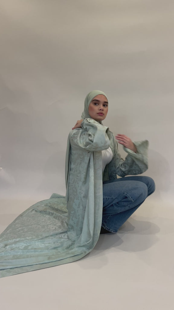 Confectionné dans un tissu fluide aux motifs délicatement texturés, ce kimono offre un tombé aérien et raffiné. Sa teinte céladon, douce et lumineuse, incarne une élégance intemporelle.