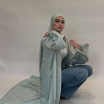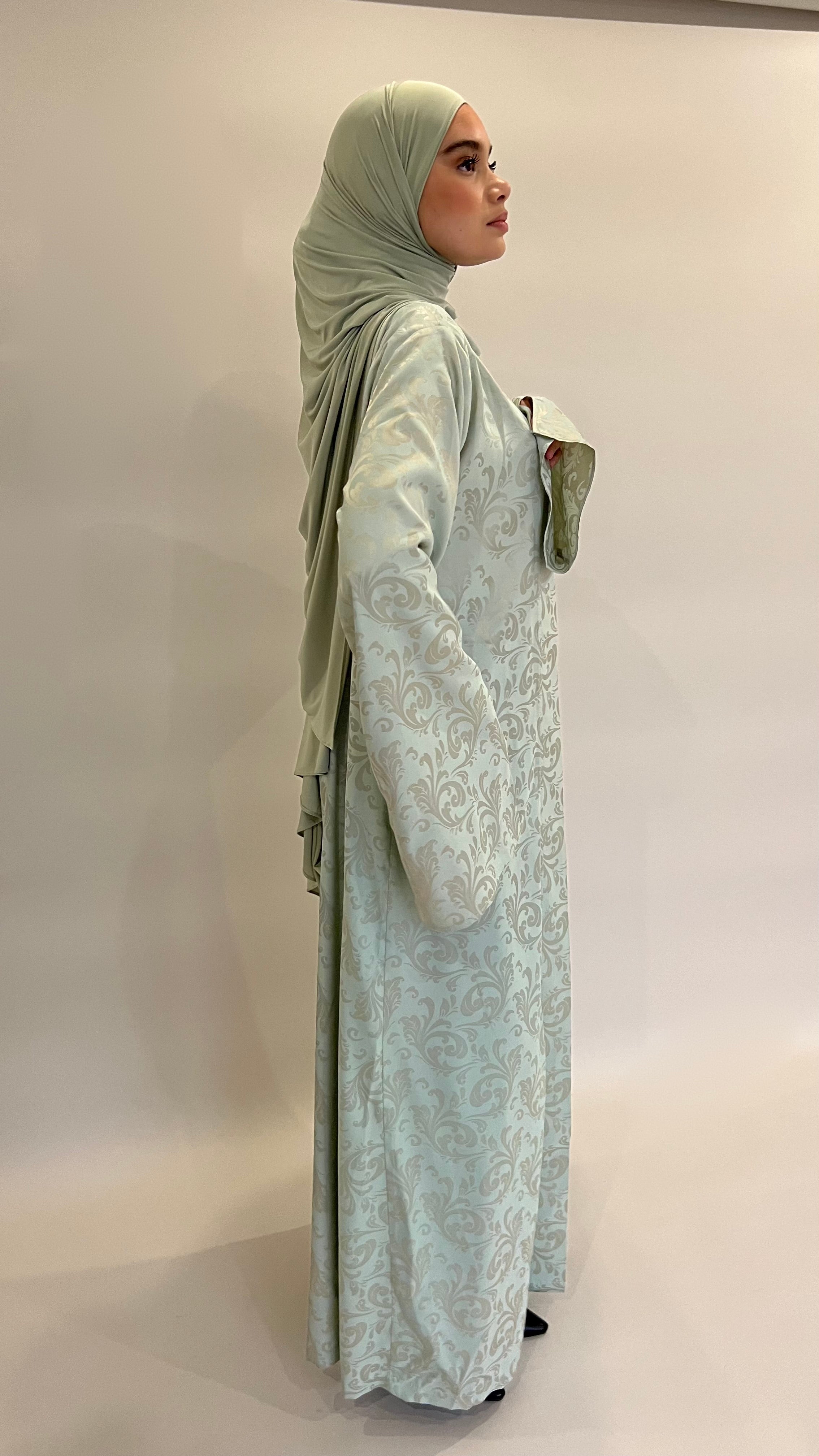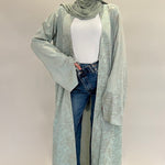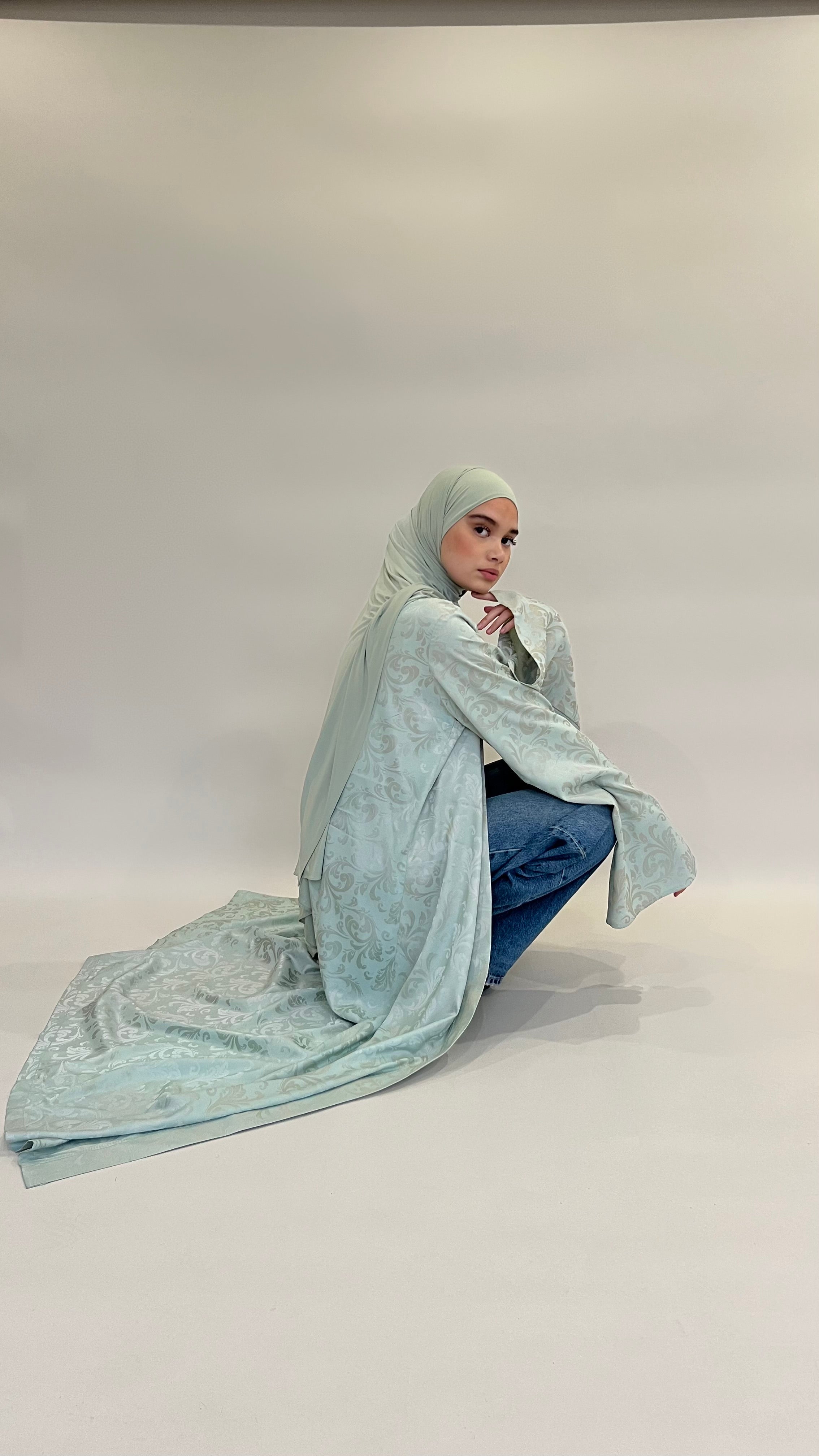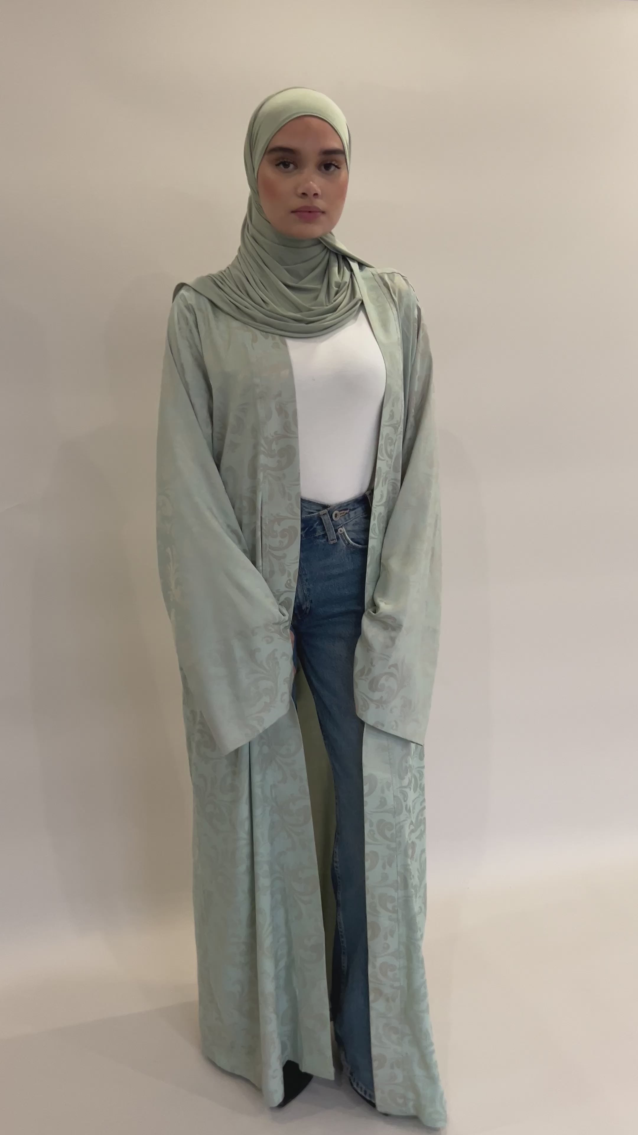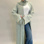 Confectionné dans un tissu fluide aux motifs délicatement texturés, ce kimono offre un tombé aérien et raffiné. Sa teinte céladon, douce et lumineuse, incarne une élégance intemporelle.
