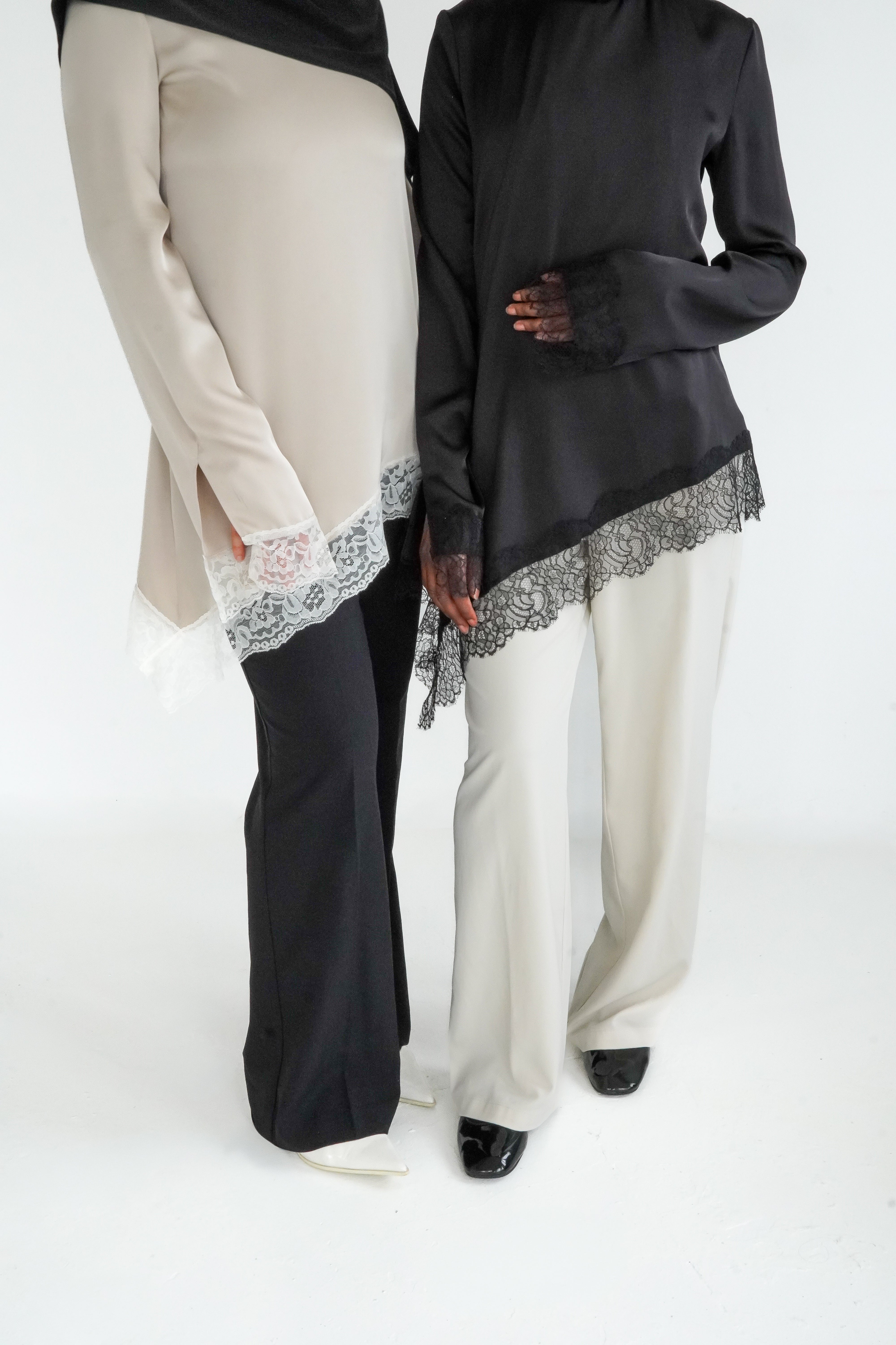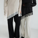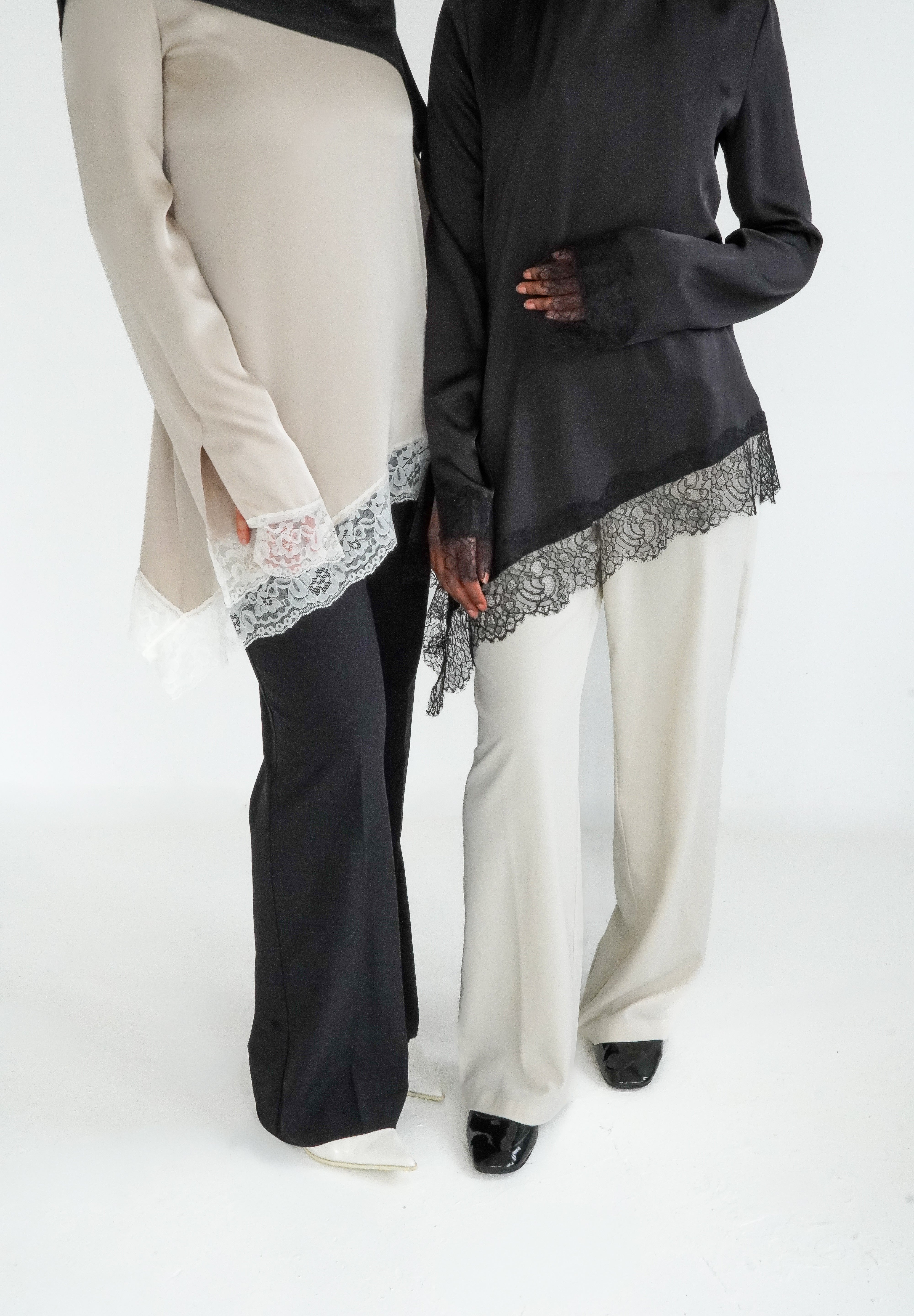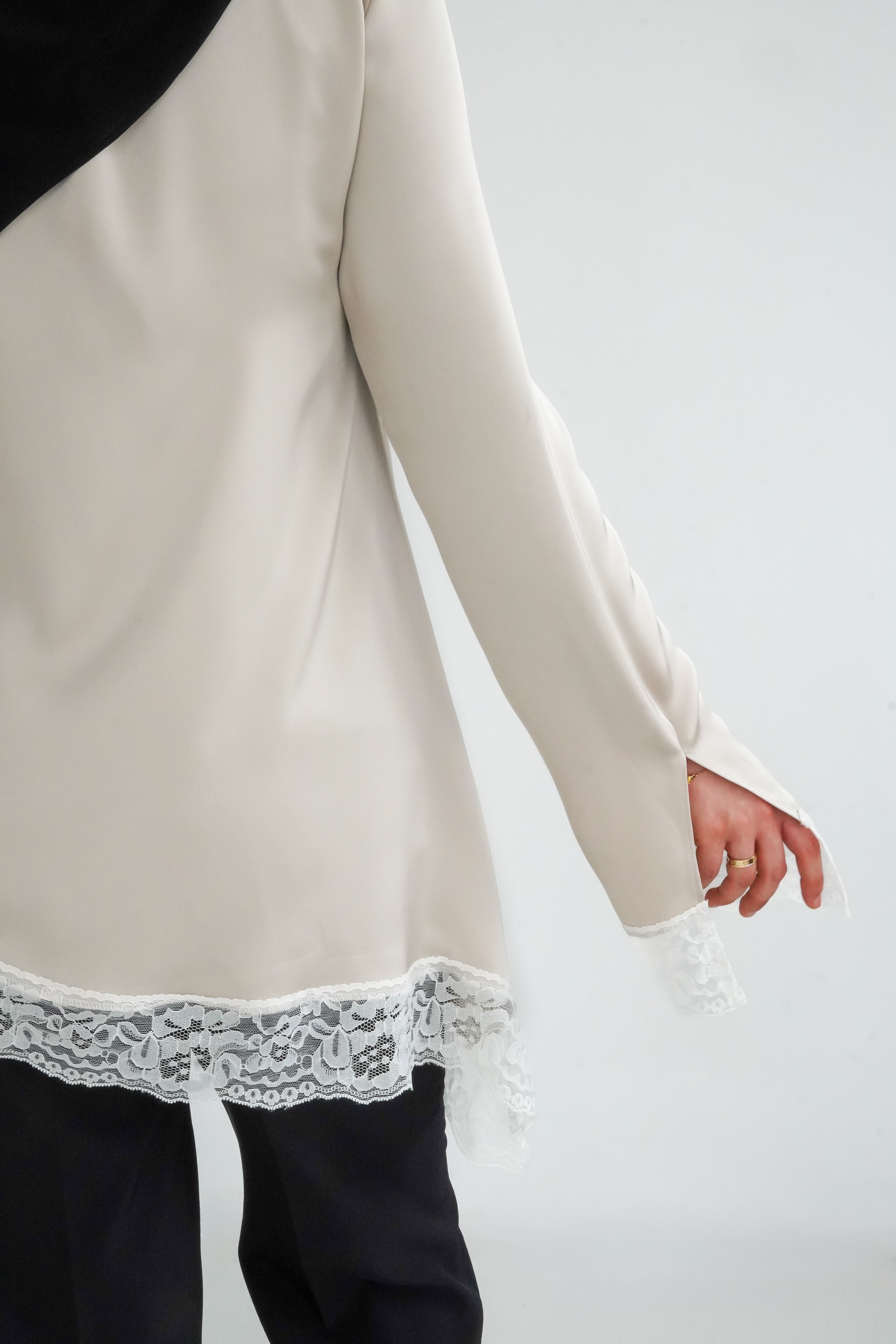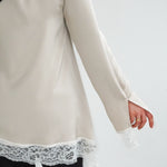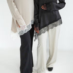 Découvrez notre haut à dentelle, une pièce intemporelle confectionnée en satin premium avec une finition en dentelle de Calais.