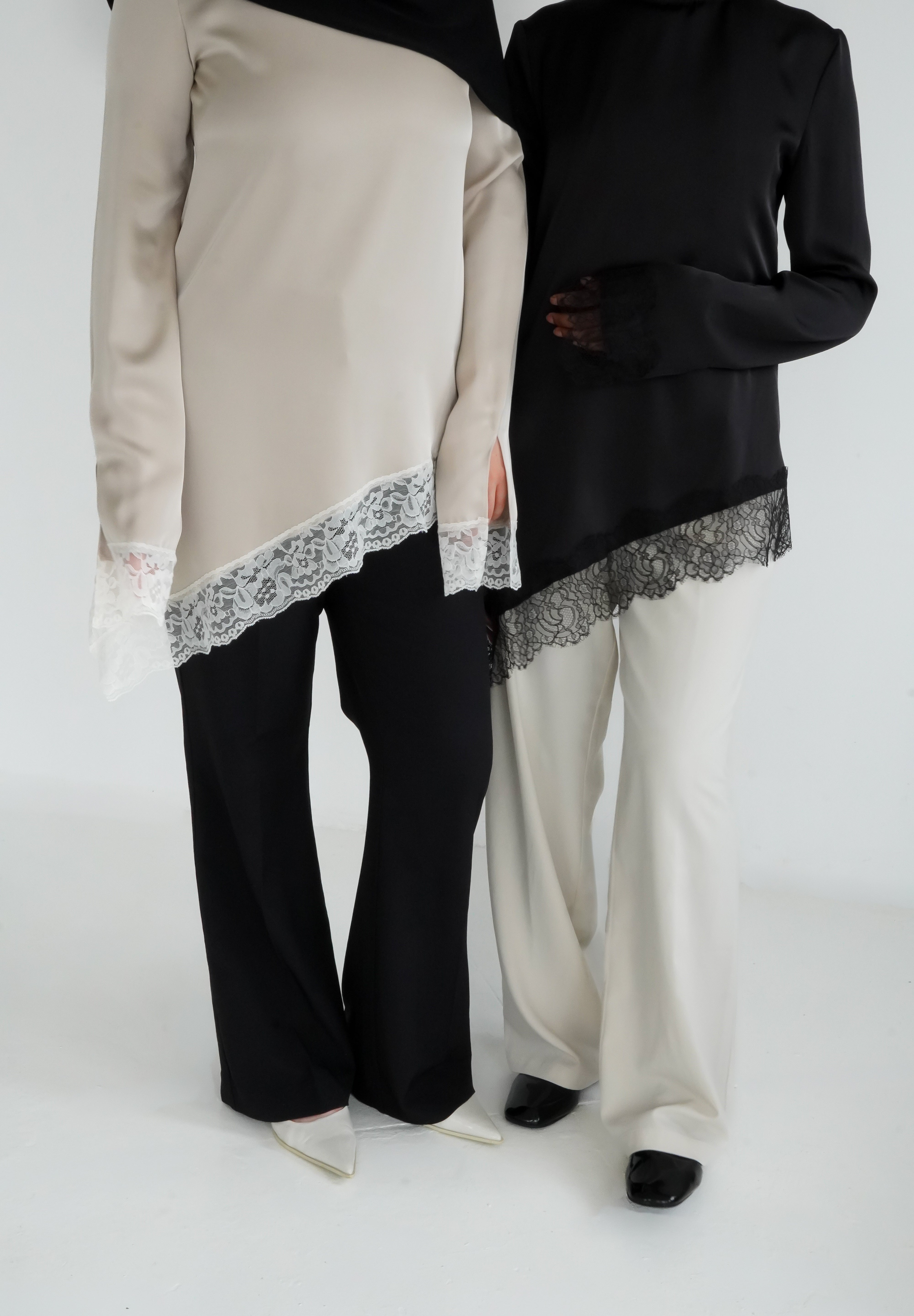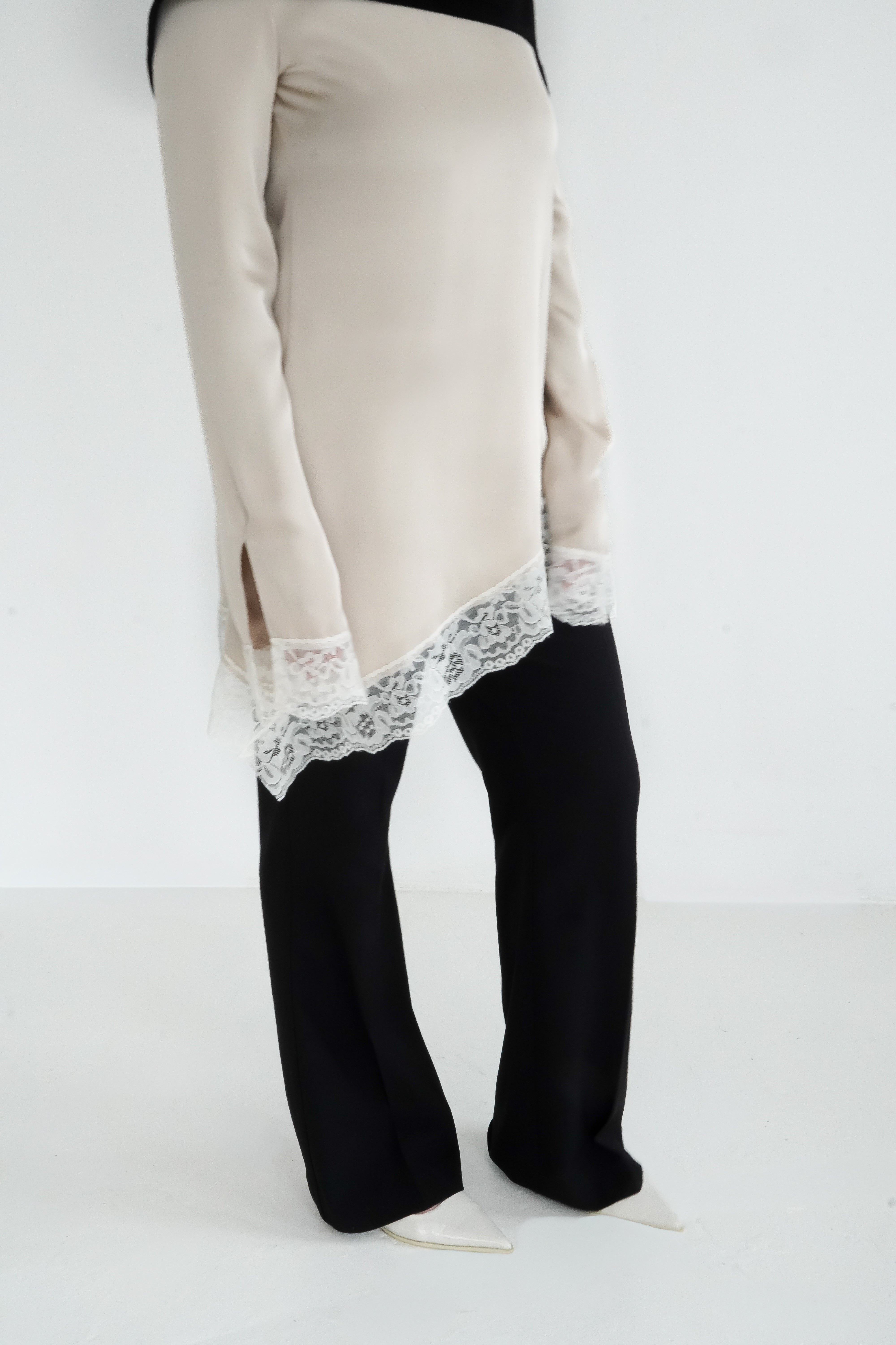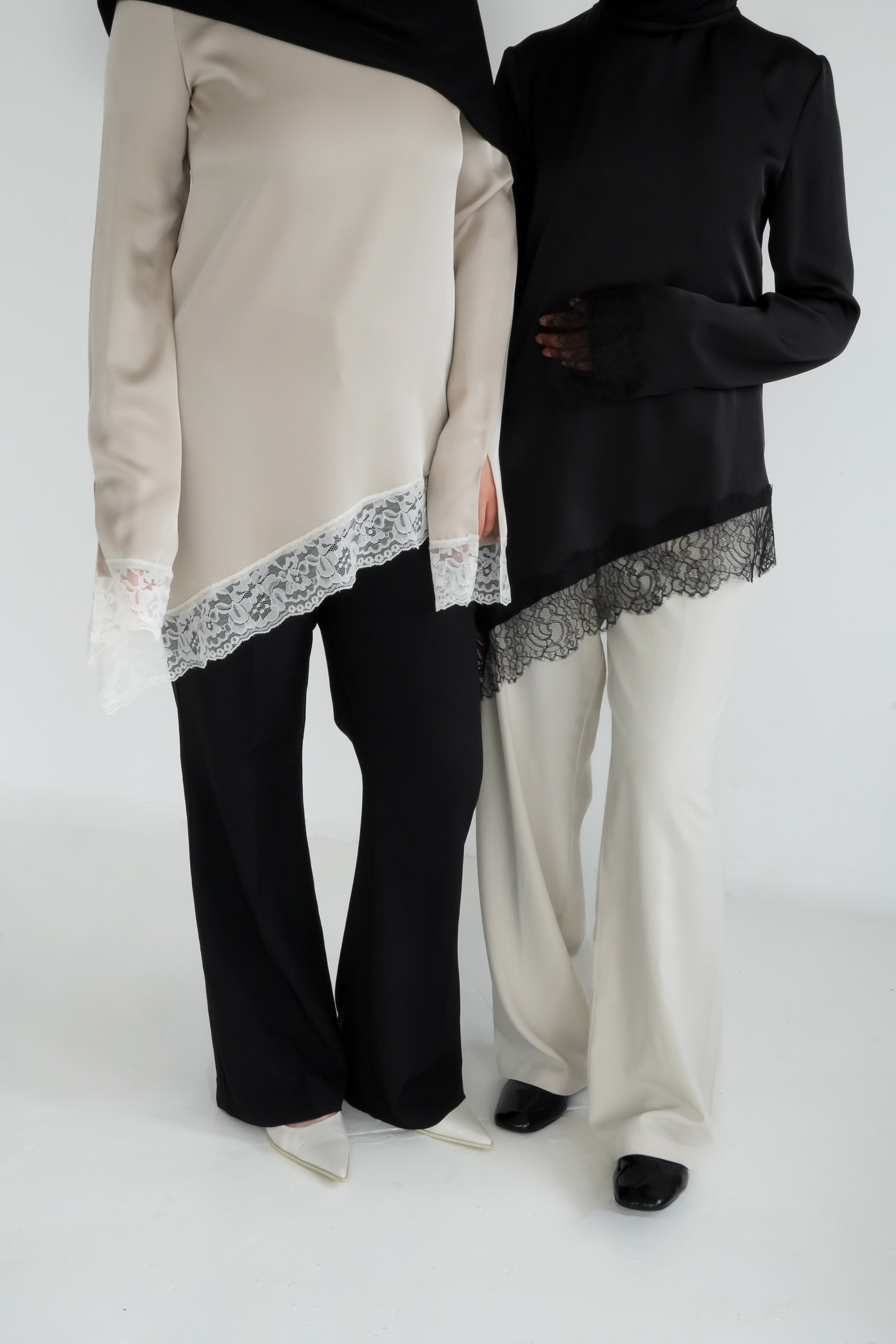 Découvrez notre haut à dentelle, une pièce intemporelle confectionnée en satin premium avec une finition en dentelle de Calais.